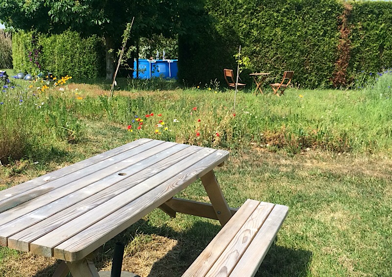 In het midden een picknicktafel met een gemaaide open plek en een gemaaid paadje.