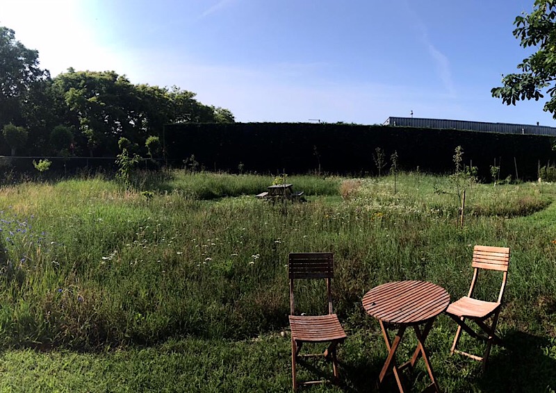Daarachter de bloemenweide met (exotische) fruitbomen in ontwikkeling