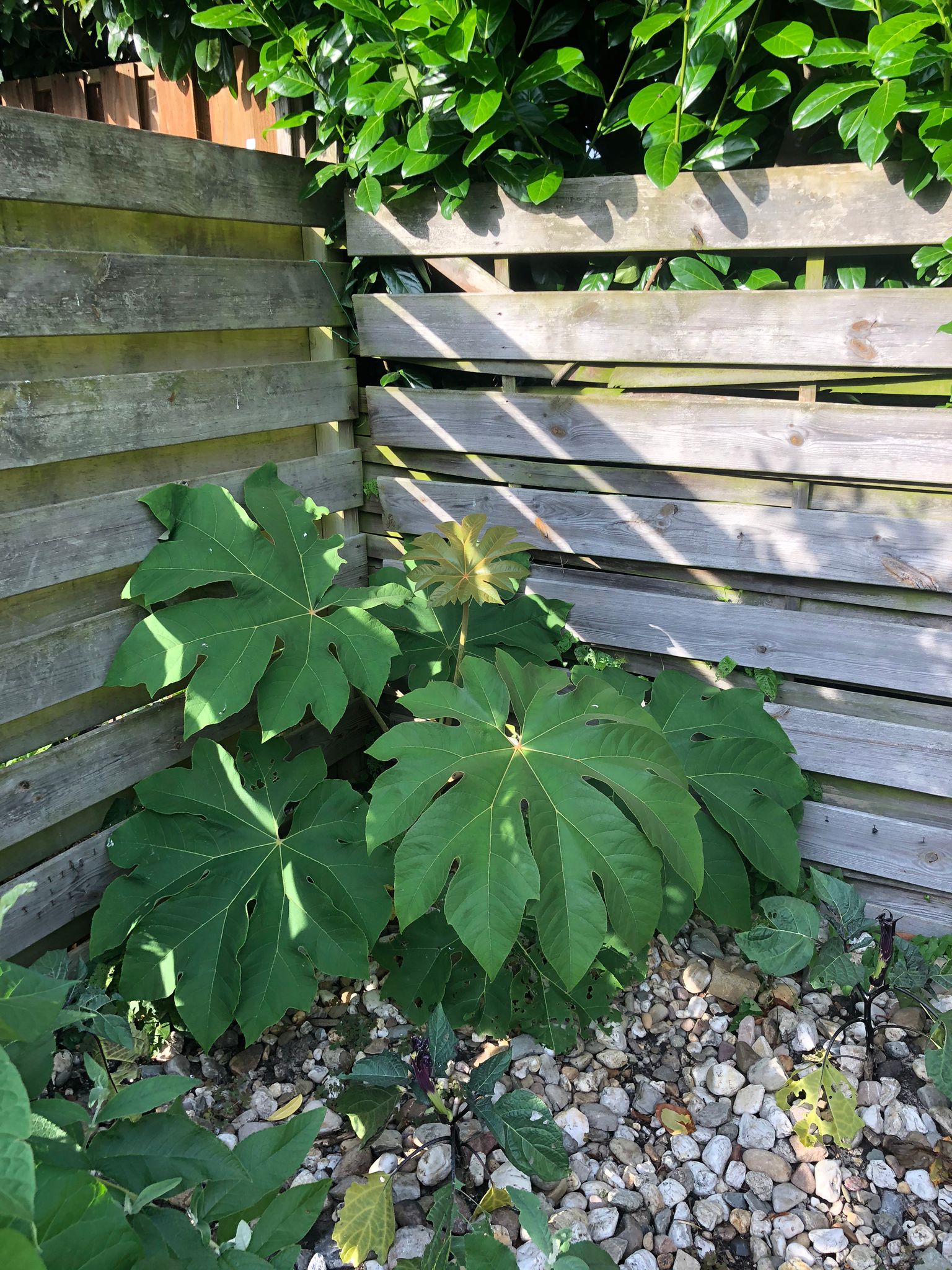 Tetrapanax. De Datura's worden helaas elke nacht of elke regenechtige dag belaagd door slakken. Zelfs de bloemen zijn niet veilig.