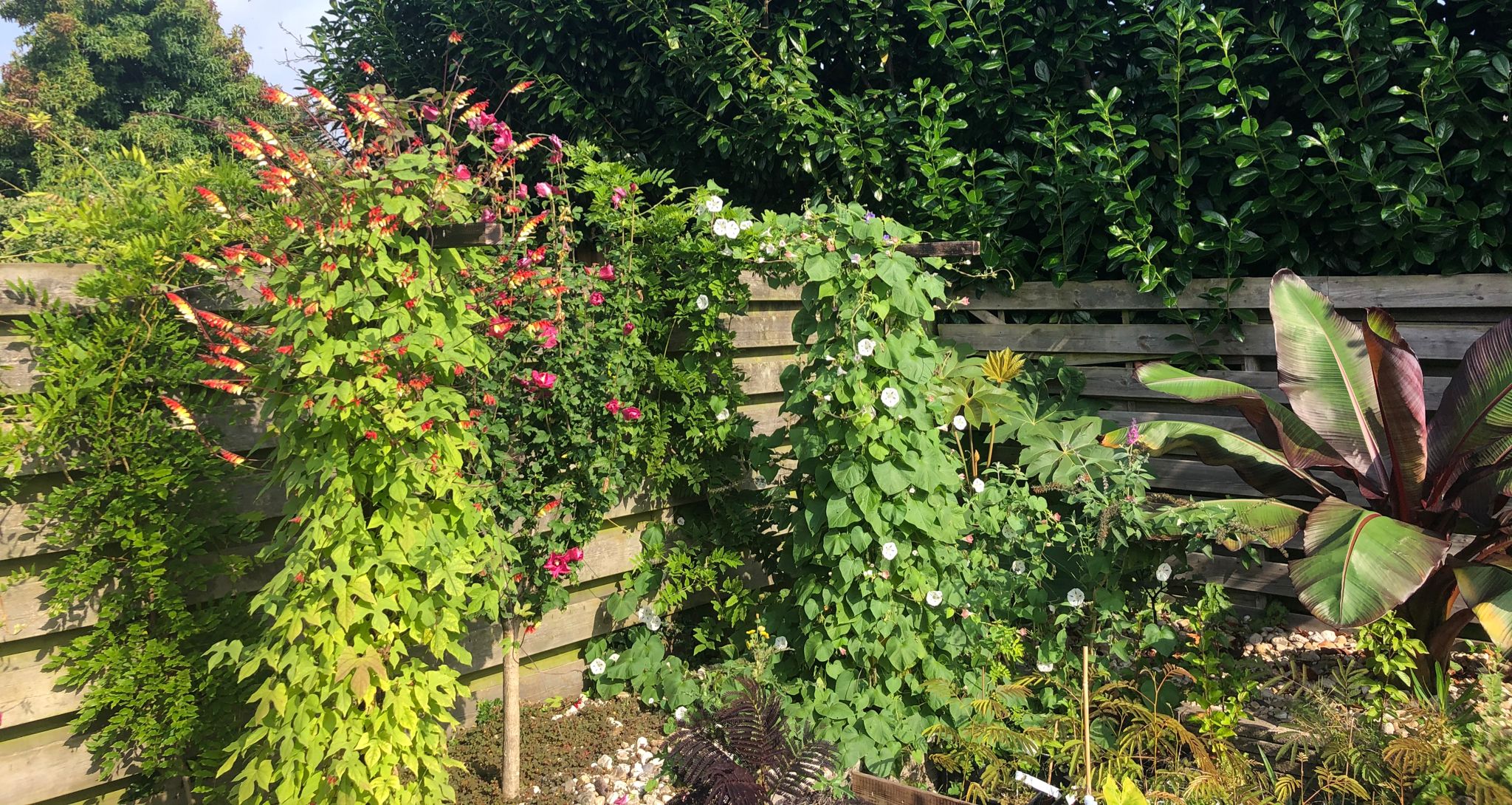 Musa itinerans var. Itinerans begint nu ook steeds sneller te groeien. Hopelijk in de herfst update al een redelijke plantje. Ik wou tussen de Begonia-Fatsia en Musa itinerans nog mijn Brugmansia Maya poten maar er zijn hier erg veel slakken en het is nog geen giga plant. Even verder opkweken nog. (oudere foto zonder de Begonia)