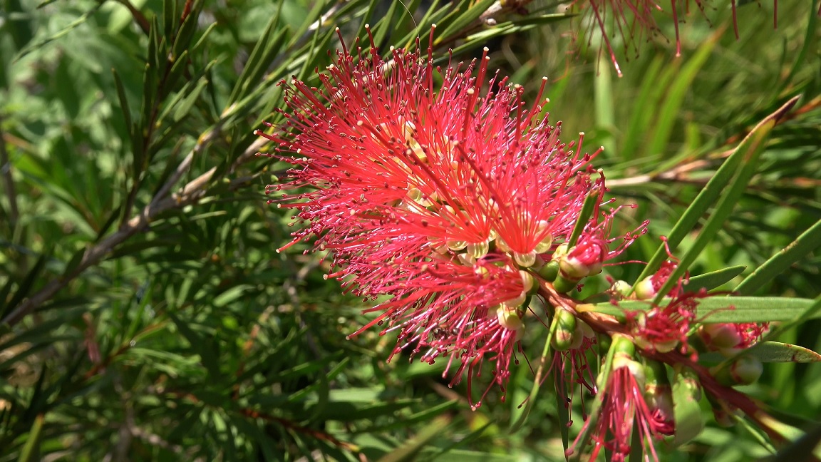 Op dit moment staat de Callistemon 'Woodlanders Red' the bloeien in de voortuin! Dit is toch wel de meest winterharde rood bloeiende Callistemon. Prachtige bloemen, voorbijgangers maken er foto's van, maar verder niet echt een geschikte struik voor een tuin vanwege de natuurlijke groei. Hij staat hier al bijna 5 jaar "in de steigers" en moet ieder jaar flink terug gesnoeid worden om hem er goed uit te laten zien. Echt voor liefhebbers dus!