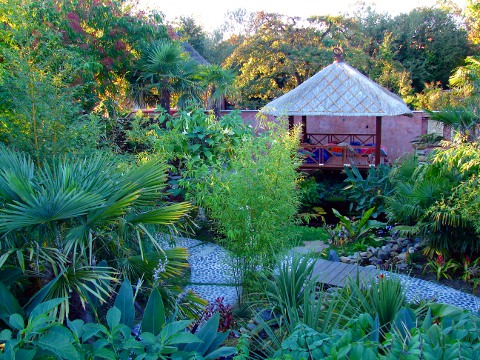Dat laantje met dicksonia is heel indrukwekkend, maar die foto met dat gelige prieeltje in het verlengde van het water met die wysteria erboven is wel echt een plaatje - het trekt je aandacht naar achteren toe alsware het een tunnel.