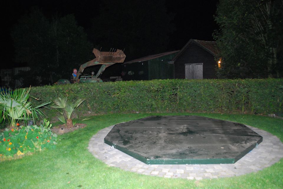 Gaten maken voor de 4 palen die het dak moeten lieren, wat heb ik een spijt dat ik destijds met het maken van het zwembad zo verschrikkelijk veel beton heb gestort om de wanden, ik ben echt 3 dagen aan het beton hakken geweest om de palen te kunnen zetten. Daarna dacht ik eventjes totaal aan 1 kub beton genoeg te hebben om de palen strak aan het zwembad te zetten, dat werd 3 kub beton storten, maar het beton met de palen zit nu vast geankerd met betonijzer aan het zwembad. Mocht ik ooit verhuizen dan wordt dat een leuk klusje, het bad met palen en dak moet er in 1 geheel uit of het word sloop haha.