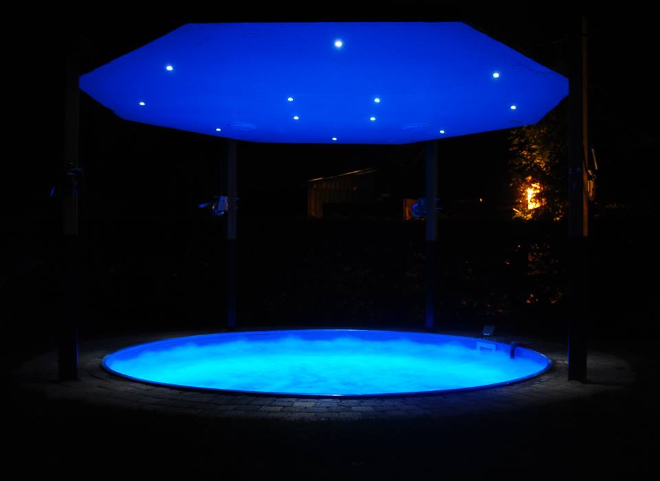 s'Avonds bij nacht, bubbelbad verlichting en de spotjes in het dak aan.