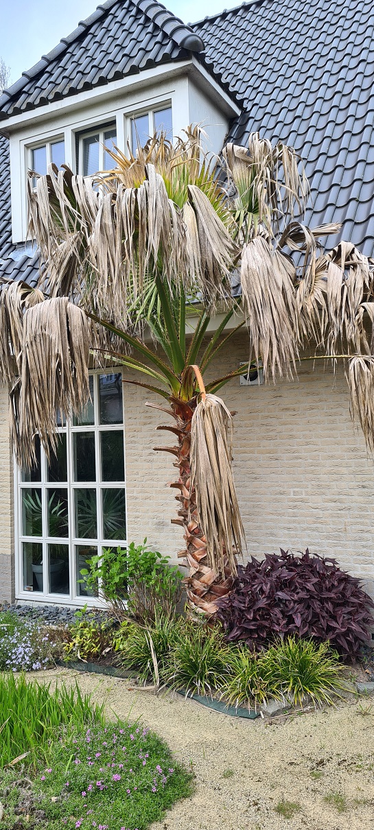 Toen het duidelijk werd dat eea verder zou uitdiepen heb ik er een streng lampjes om de stam omgedaan, er een stuk bekleding tegenaan gegooid (niet eens geheel rond), en vervolgens een lap bubbelfolie, met de intentie om nog iets van warmte te realiseren ter hoiogte van de groeipunt.