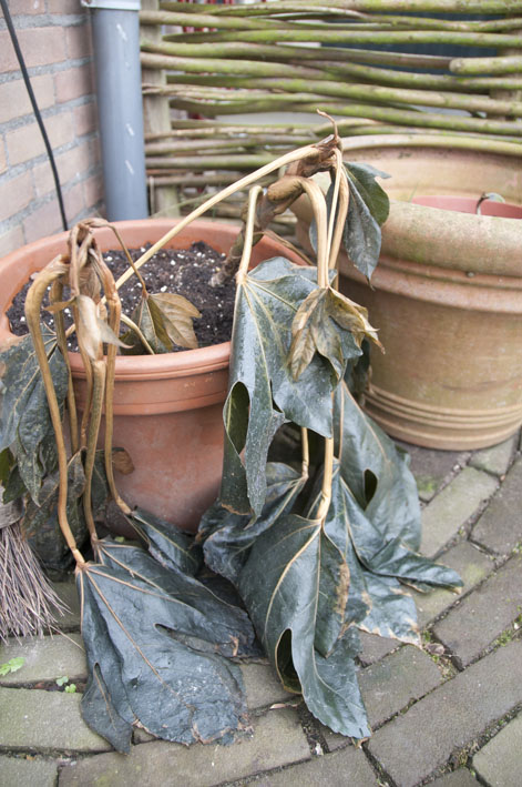 2 bonte fatsia's in pot, ik geloof niet dat het nog goed gaat komen.jpg