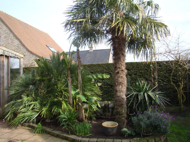 De washingtonia is nog net in de winterbescherming geraakt, volgende winter gaan we toch zijn bladeren moeten afsnijden, en daarna zien we wel...
