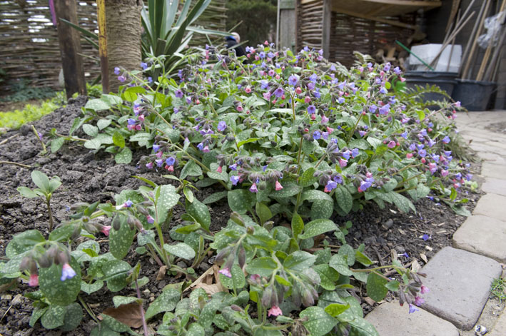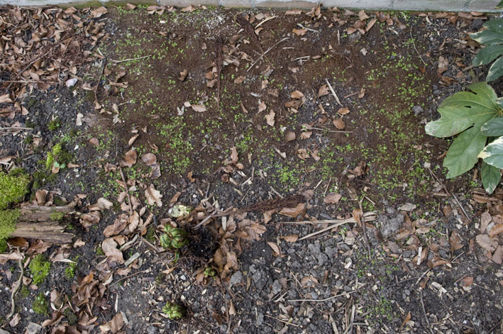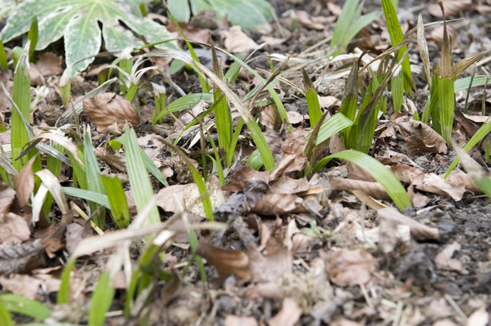 Verder zien we gelukkig hier en daar al wat herstellen van de winter. Een aantal planten staan er nog bijzonder troosteloos bij, maar blij word ik wel van dat de fargesia robusta de grond uit knalt en er al een paar fatsia japonica aan het herstellen zijn. Ook komen de varens in beweging en worden er al wat rollen uitgegooit! :D