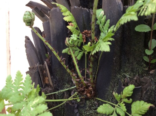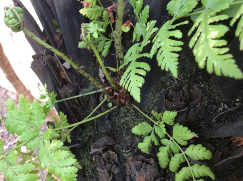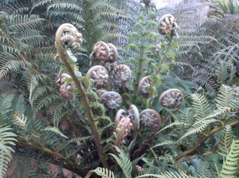 De eerste krullen van de Dicksonia boomvaren. De Dicksonia Antarctica heeft afgelopen winter zijn oude blad weten te behouden.
