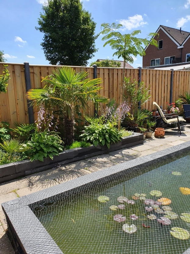 Het is een continu gevecht met een reiger. Dat beest is brutaal! Ik heb een tweede net over de vijver moeten spannen. Het eerste was al stukgemaakt door de reiger. Helemaal in het begin, in maart is er een shubunkin vis geroofd. Sindsdien gaat het goed. Het net erover kan nou eenmaal niet anders.