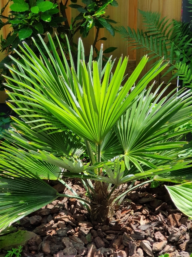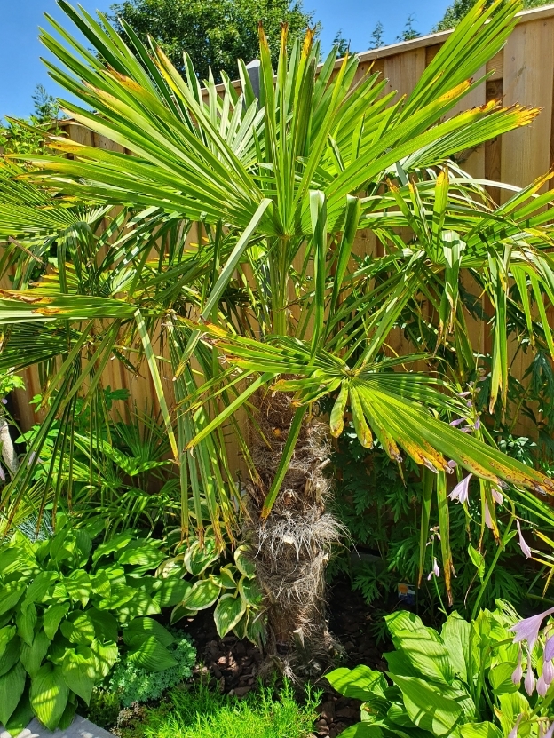 De grote Trachycarpus is intussen totale hoogte 2.70. Stam is nu 1.70.