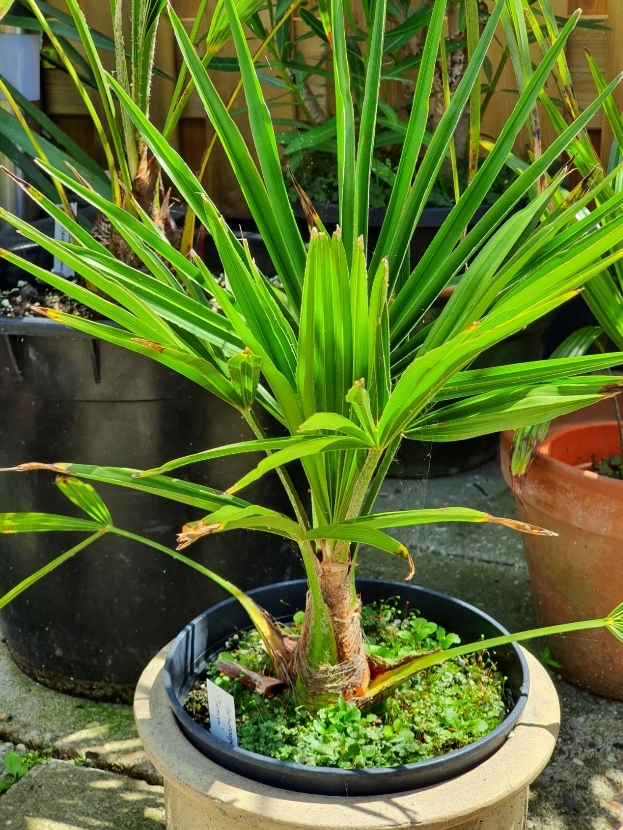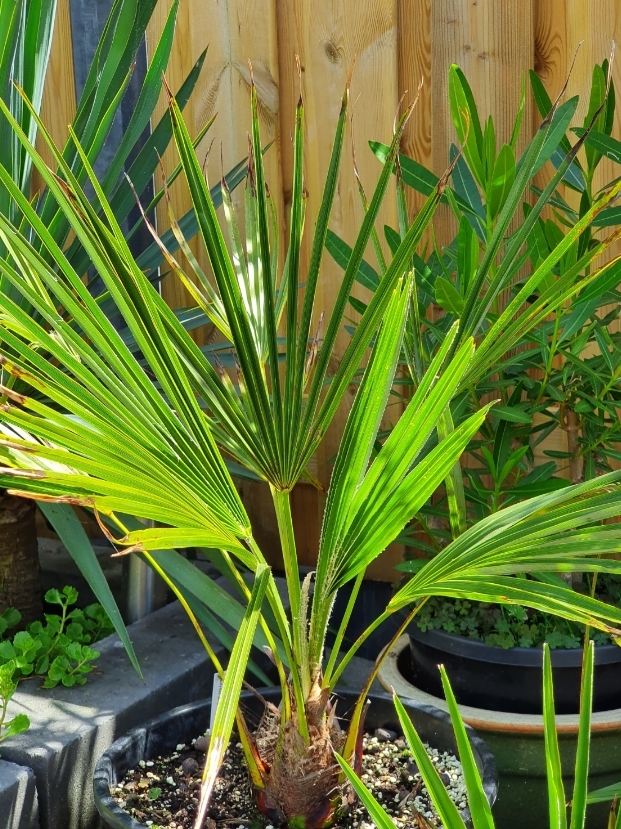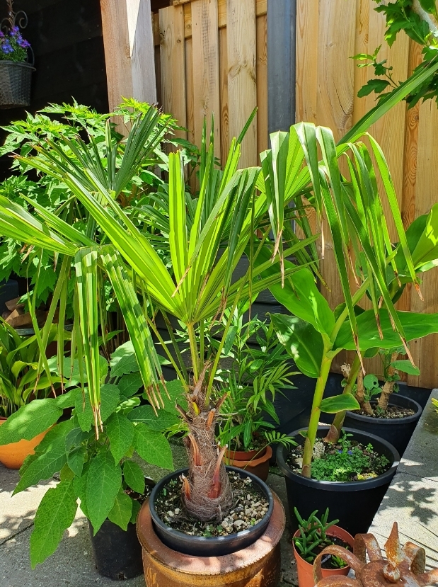 Alle palmen groeien echt goed. Van sommige soorten nog steeds niet helemaal duidelijk welke Trachycarpus het nu eigenlijk is, maar de tijd zal het leren. Zijn allemaal goed de winter doorgekomen. Ook de palmen in pot. Deze hebben tegen droog aan overwinterd onder de overkapping. Wel vorst gehad dus.