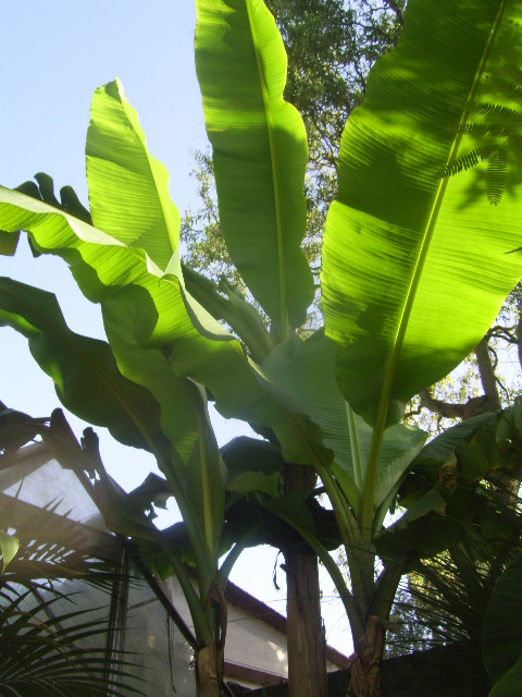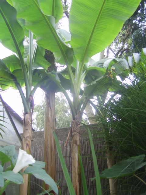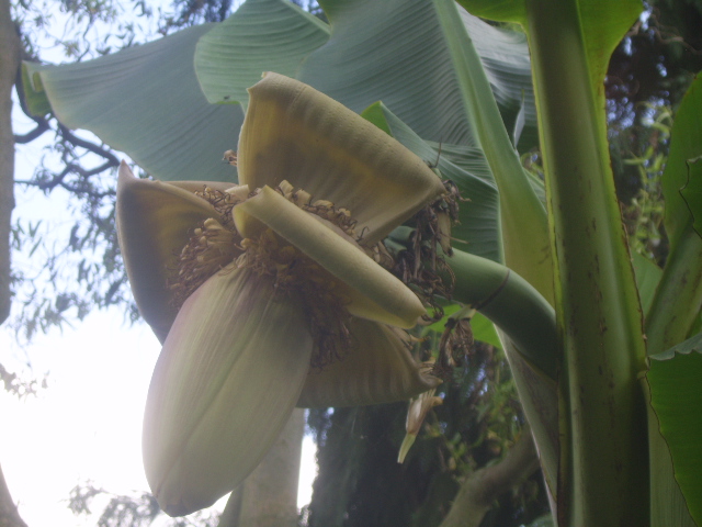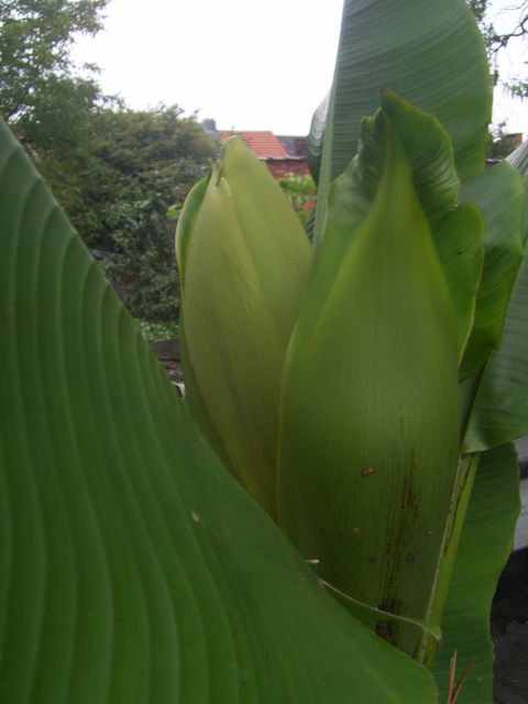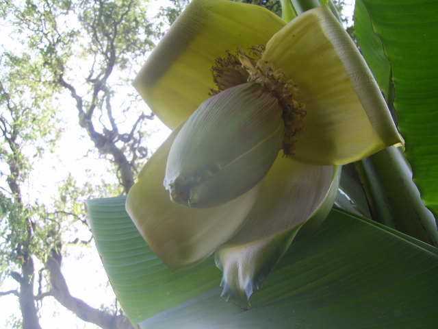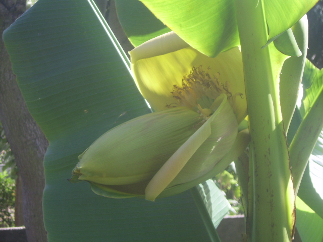 er zijn 2 grote bananenplanten die een prachtige bloem geven met piep kleine banaantjes,