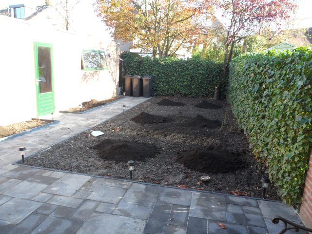 Onze tuin was eigenlijk alleen maar compost, maar ook flink verzakt er is 50 kuub grond bijgekomen, niet van goede kwaliteit. Bladafval, nieuwe grond en oude grond hebben we flink (met een graafmachine) door elkaar gemengt en nu is de grond prima. Er zijn ook heel wat zakken gedroogde koemest doorheen gegaan. Kippen en eendenpoep hebben we volop en dat gaat ook altijd bij de planten en door de grond heen. Onze grond is nu goed luchtig, vorig jaar bleven er nog plassen staan, nu loopt het water mooi weg, planten groeien goed dus ik ga ervanuit dat de grond dan ook goed is. Het is hier nu 1 groot afgevallen bladfestijn! :D