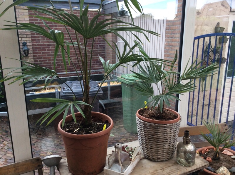 Na wat omzwervingen zijn ze binnen. Rechts trachycarpus princeps en links de trachycarpus princeps new form Hybride.