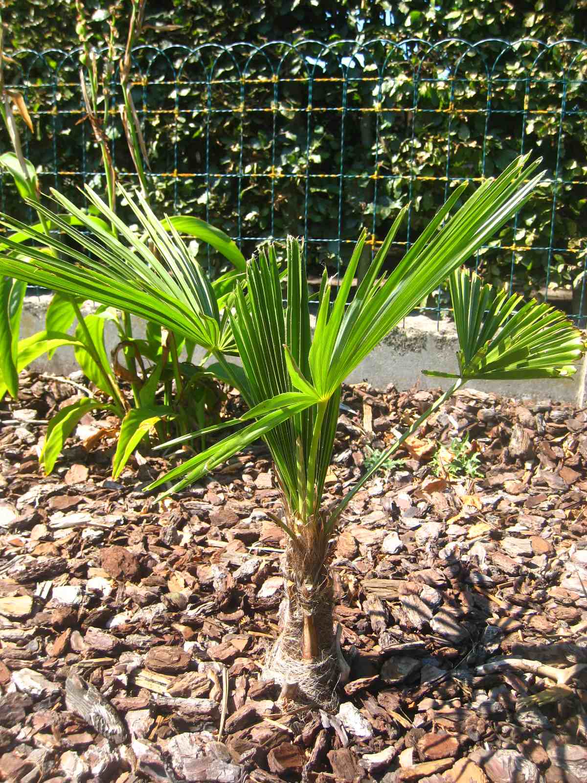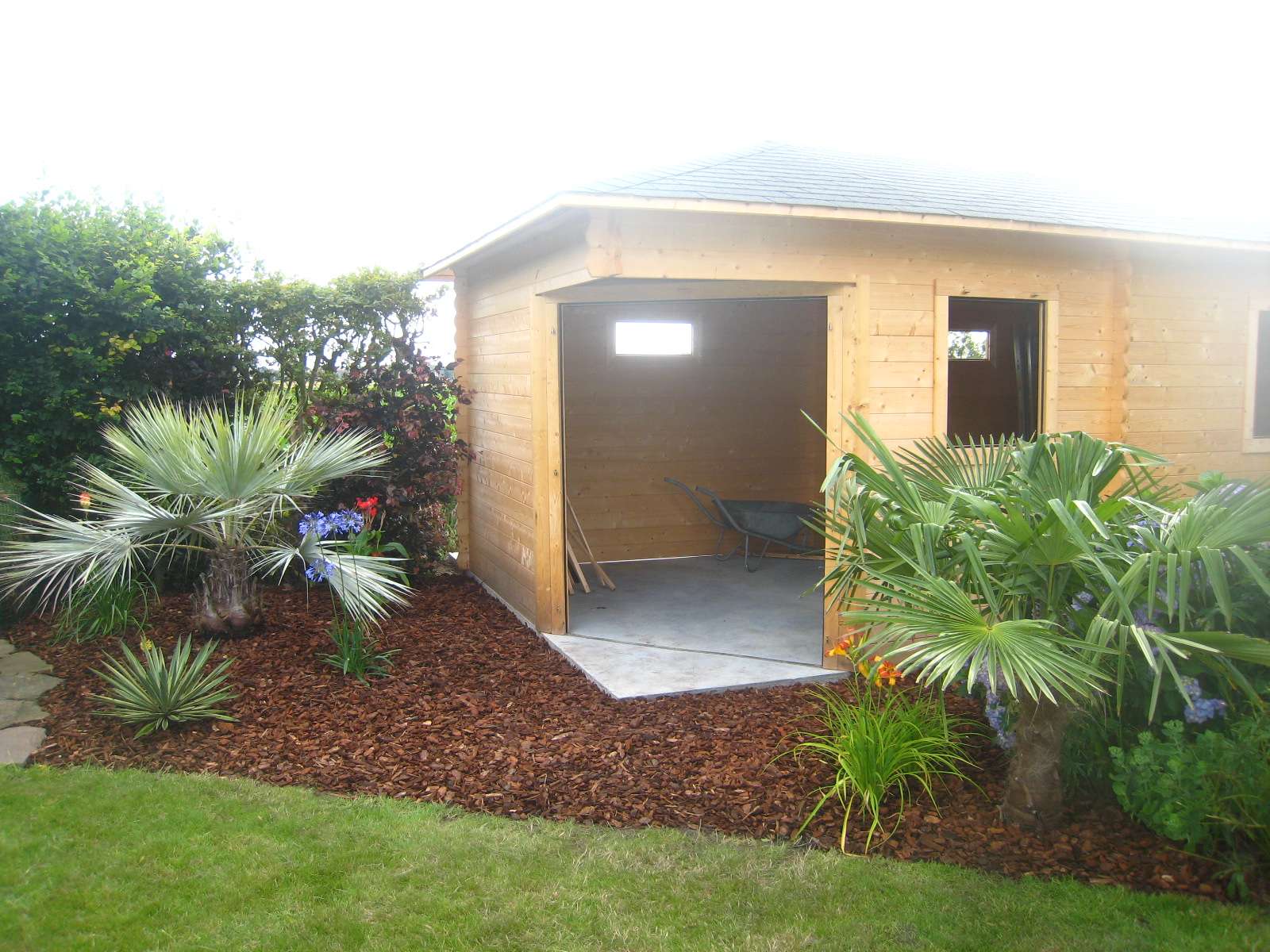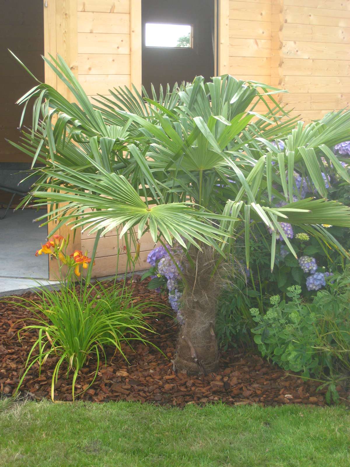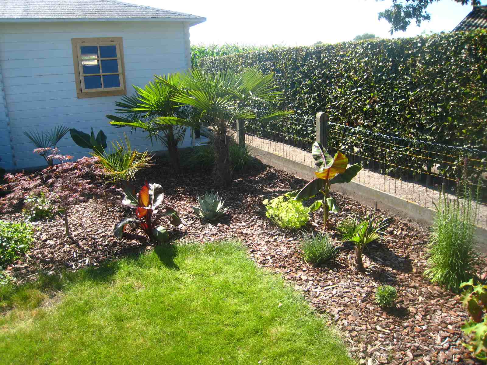 Gisteren eindelijk het stuk voor het tuinhuis kunnen afwerken met enkele bloemende planten, een trachy en een dikke laag schors. Nu nog een een graad of 10 warmer en tis helemaal in orde :fluiten: