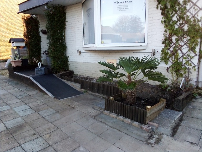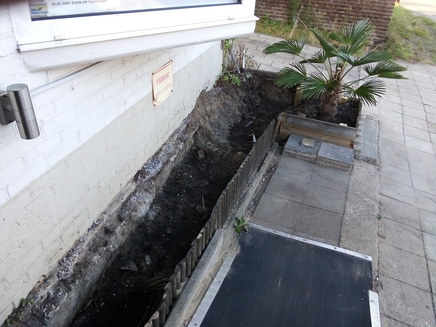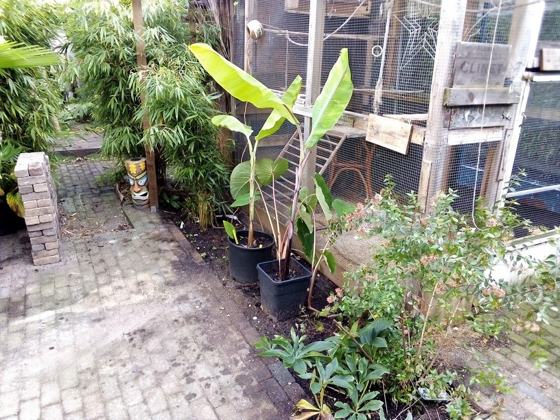 1 Nieuwe border is klaar. Vroeger 6x6m klinkers gelegd om een tent voor proeverijen op te plaatsen en nu langzaam een deel weer ophalen en beplanten. Zo blijft een mens bezig. Maar omg onder de stabilisé zat nog een laag van 20cm dolomietmix dat ik met drilboor moest losmaken om het op de schop te krijgen. Daaronder zwarte zand. Op foto hoe het er normaal volgend jaar gaat uitzien met de bananen in de grond natuurlijk.