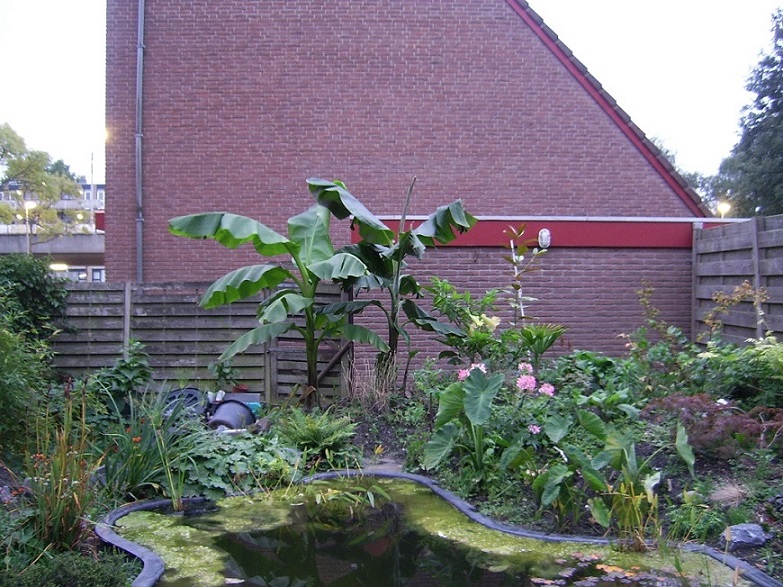 De Musa's naast mijn huis. Ook een basjoo en een sikkimensis maar zoals gezegd kleiner dan de Musa's in mijn achtertuin. Verder heb ik in de herfst van 2013 een Albizia julibrissin geplant. Dit keer gelijk maar een grote omdat ik er al één verloren ben en grote exemplaren een betere overlevingskans schijnen te hebben. Tot nu toe lijkt dat inderdaad het geval. Hij begint voorzichtig al weer wat uit te lopen maar valt op de foto nog volledig weg tegen de struik die erbij staat.