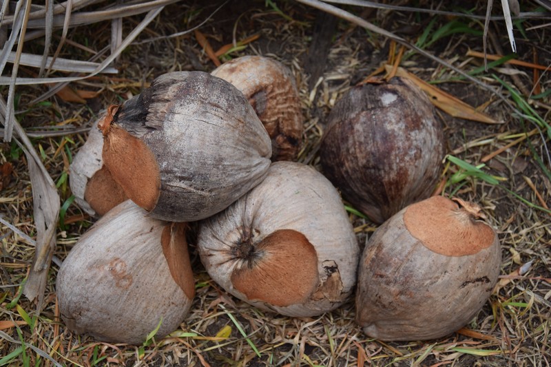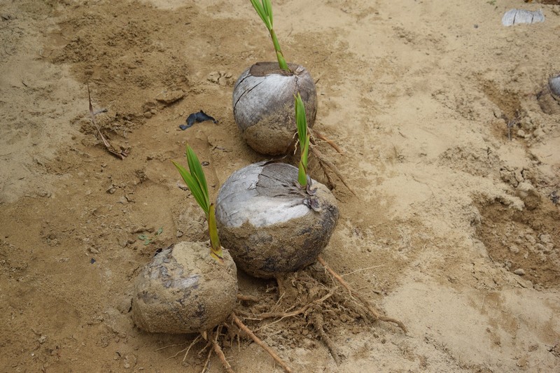 Als de noten rijp zijn worden ze geoogst en met een machete bewerkt aan de zijde waar de 3 ogen zitten, dit zorgt ervoor dat de kiem sneller en makkelijker uit een van de ogen kan groeien. Vervolgens worden ze in zand gezaaid.