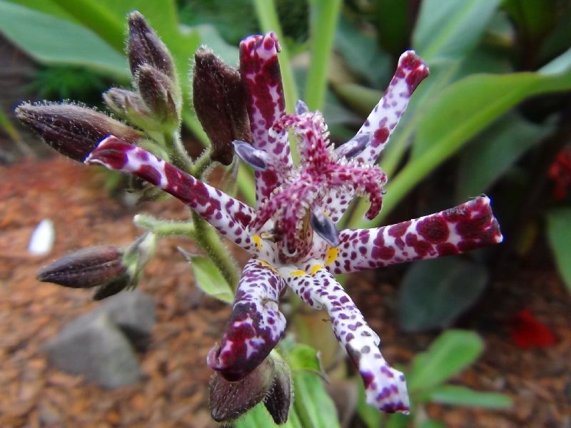 op de bodem ligt er boomschors die rood is gekleurd ,heeft wel een mooi effect met al het groen vind ik