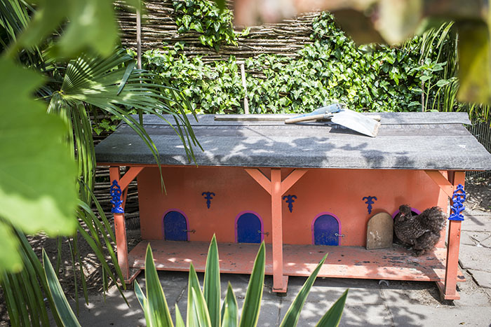 Een prachtige exotische tuin Corinne. :D Het kippenhok is zeer intrigerend. :o Het is dat een van de bewoners erbij staat anders ... Zo te zien zijn de hoenders geen voordeurdelers en hebben ze ieder een eigen optrekje voor de nacht ?