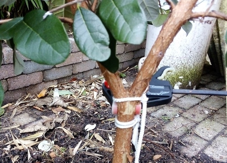 Net wat draad gespannen voor zomers klimplanten zoals klimroos, passieflora, bugainvillea, reukerwt etc. dan de Ananasguave - Feijoa sellowiana is gesplit door de sneeuw die erop lag dus een klem op gezet maar weet niet of dat de plant gaat redden