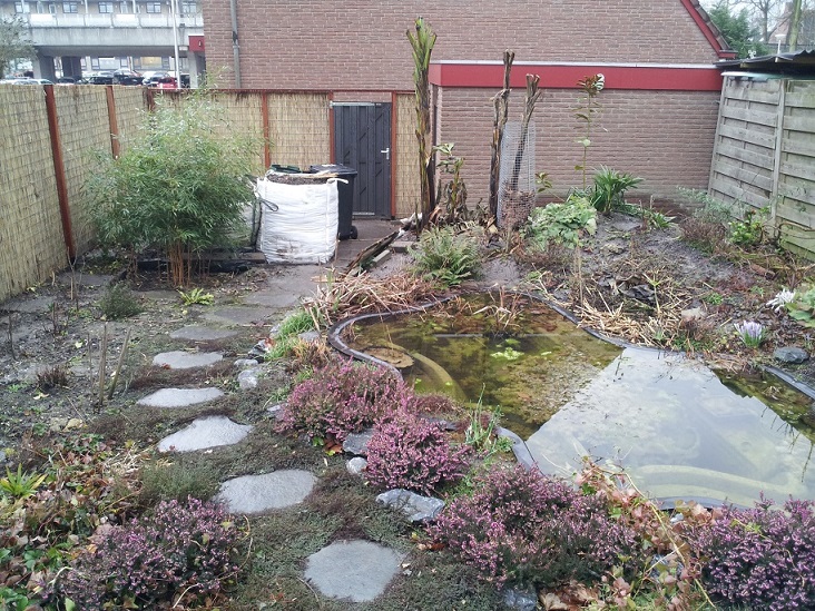 Verder heb ik de bananen uitgepakt. Misschien erg vroeg maar de 14 daagse weersverwachting geeft geen strenge vorst aan en dan zitten we al in maart. Voorlopig mogen ze dus lekker luchten. Een paar graadjes vorst kunnen ze wel hebben dus ik hoop dat ik niet opnieuw moet gaan inpakken. De basjoo ziet er nog fantastisch uit: helemaal groen en stevig, zelfs de restjes bladstelen. Van de sikkimensis zijn de buitenste 1 a 2 laagjes van de stam kapot maar verder lijken de stammen nog in goede staat. De hedychium gardnerianum die onder dezelfde winterbescherming zat ziet er wat dood en beschimmeld uit maar de stam en zelfs delen van het blad van 1 steel lijken nog in orde. Ik heb nog geen ervaring met overwintering van siergembers maar denk dat dit wel goed komt. De winterbescherming van mijn bananen bestond uit vliesdoek om de stammen, onderin wat vulmateriaal uit dozen (plastic luchtzakjes), wat blad, een lichtslang tussen de stammen (niet er om heen, worteldoek om alles heen en een groot dekzeil er overheen. Ik heb nog niet echt een vaste inpak routine en zal vast nog wel wat blijven experimenteren de komende jaren.