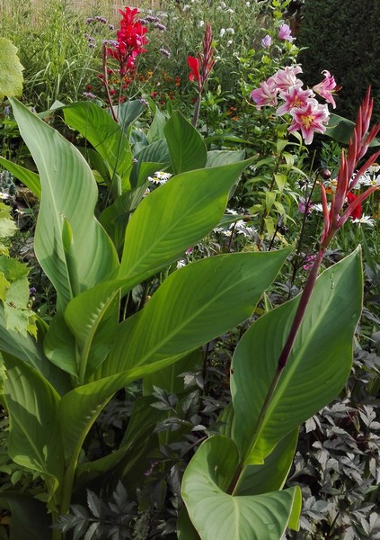 Musa's en Colocasia pink china plus burgundy stem.