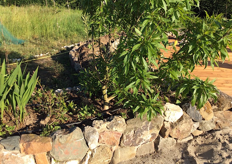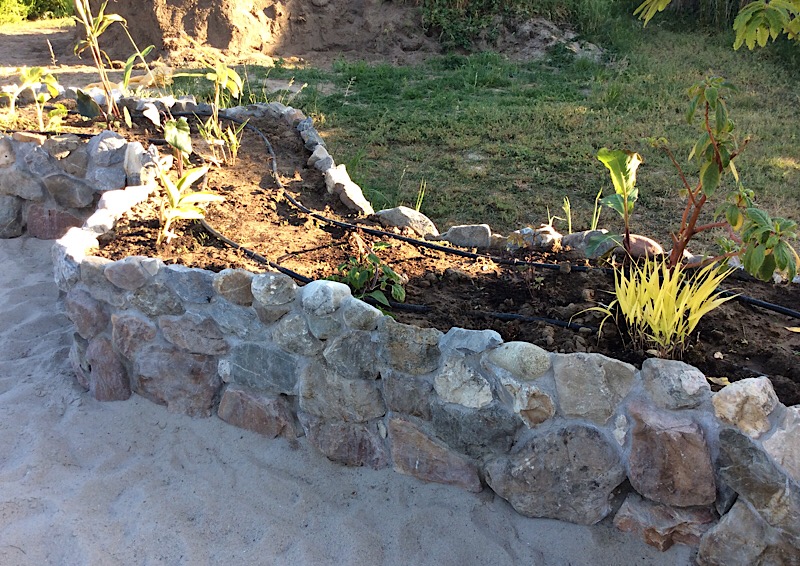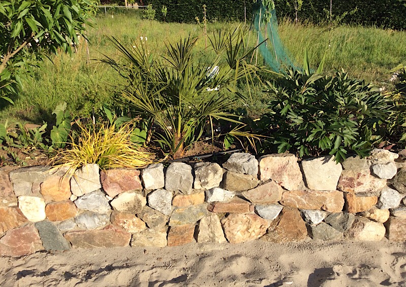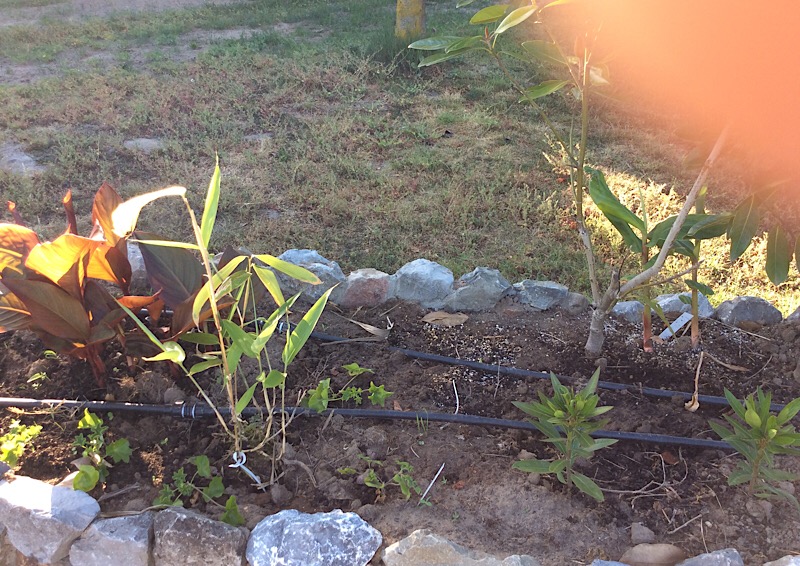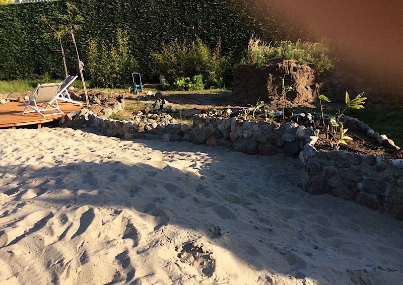 Vlonder in aanleg aan het strand. De bloembakken moeten nog afgemaakt worden. Er staan al 25 oleanders in verschillende maten in en 3 Albizia tropical Dreams die een bladerdak boven het terras moeten gaan vormen. Aan de zijkant is de planning om ooit een zwemvijver aan te leggen met waterval.