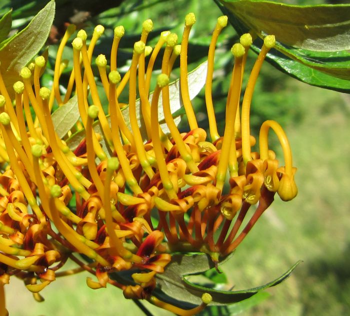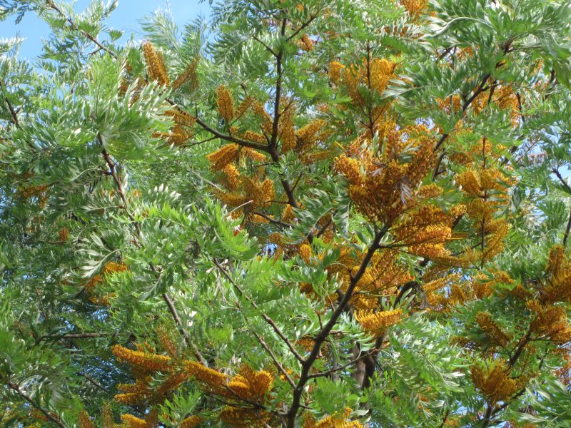 de Hippeastrum in bloei en de Grevillea robusta met bloemen. Dit jaar heeft hij ook bloemen aan de laagste takken dus kan ik wat betere foto's maken.