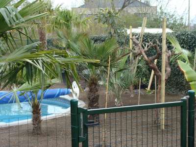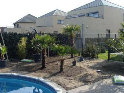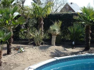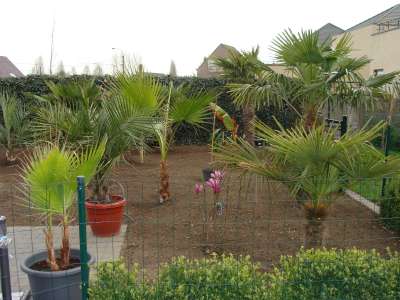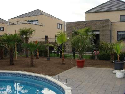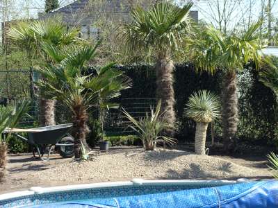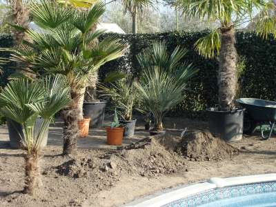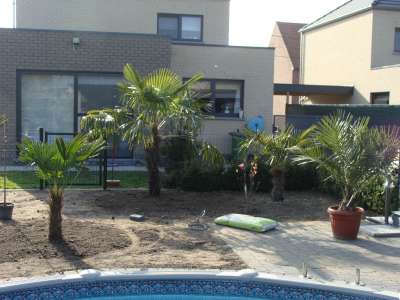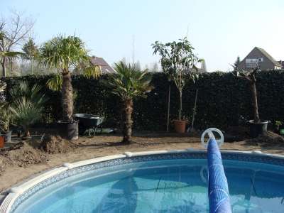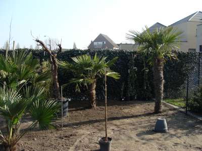 Verder nog wat onderbeplanting gezet zoals kniphofia in verschillende kleuren en de fatsia japonica, de 3 grote fortuneis (210cm,170cm,150cm stam) hebben we zaterdag de grond in gekregen. Verder zag ik vandaag toevallig dat 2 mannelijke trachy's een bloei gaan maken, bij 1 fortunei en 1 wagnerianus, vind het beetje vroeg, maar heb dit in het weekend bij nog andere mensen gezien dat sommige al bloei int verschiet hebben... Morgen gaan alle bananen de grond in : 9 basjoos, 2 sikkimensis, 1 sikkimensis red, 1 cheesmanii, 1 balbisiana, 4 musella's en 1 ensete ventricosum; allemaal samen als trosje