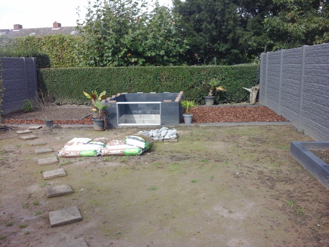 inmiddels staat links naast het raam een groter beeld waaruit mijn beekloop gaat starten....ooit. Beekloop mag een een mooie kronkel maken door de tuin en hoeft niet hard te stromen maar enkel voor het natuurlijk beeld in de toch wel strakke tuinaanleg