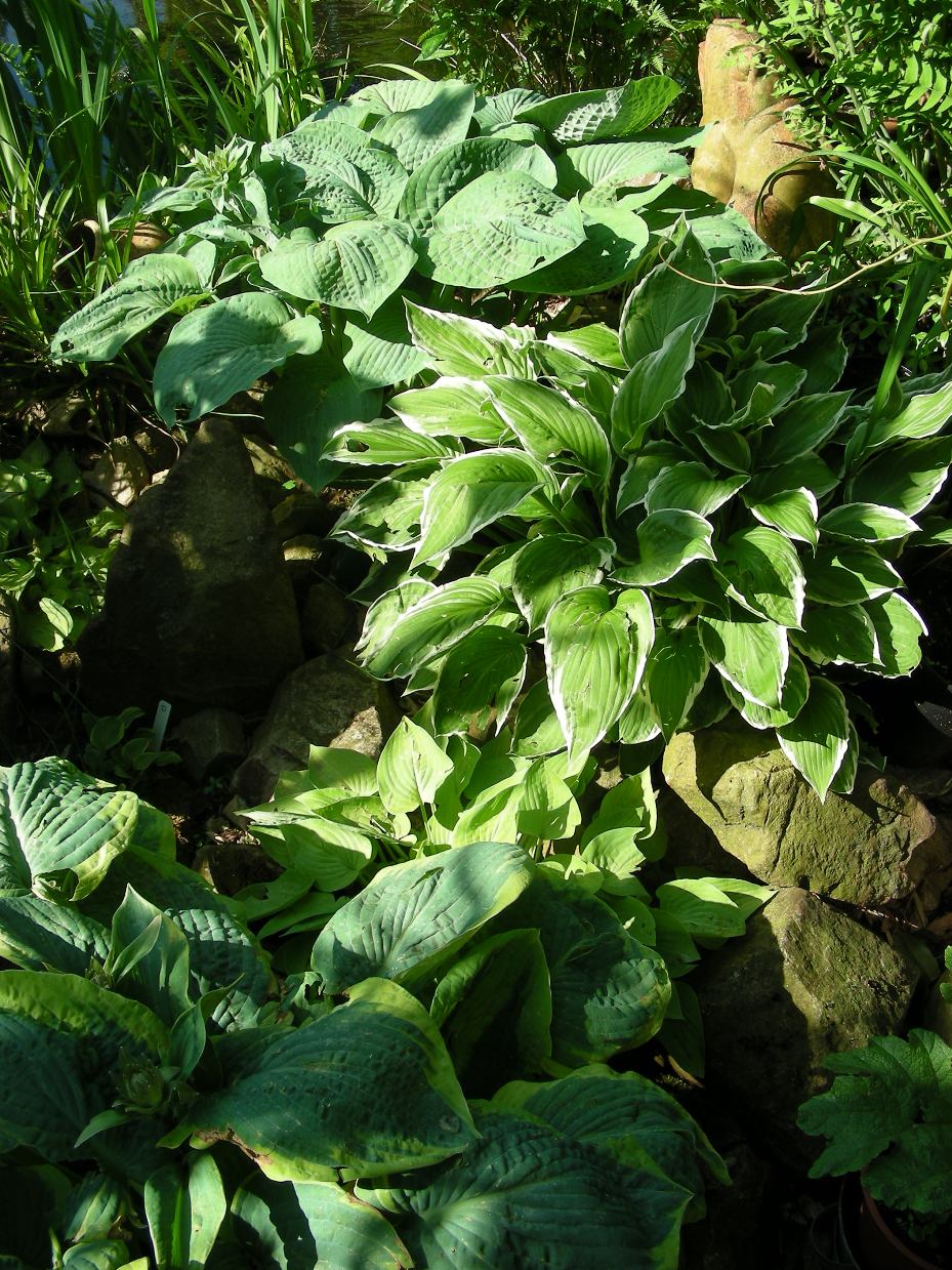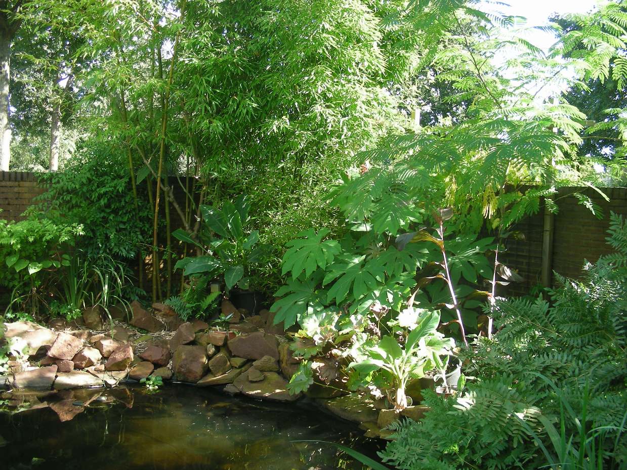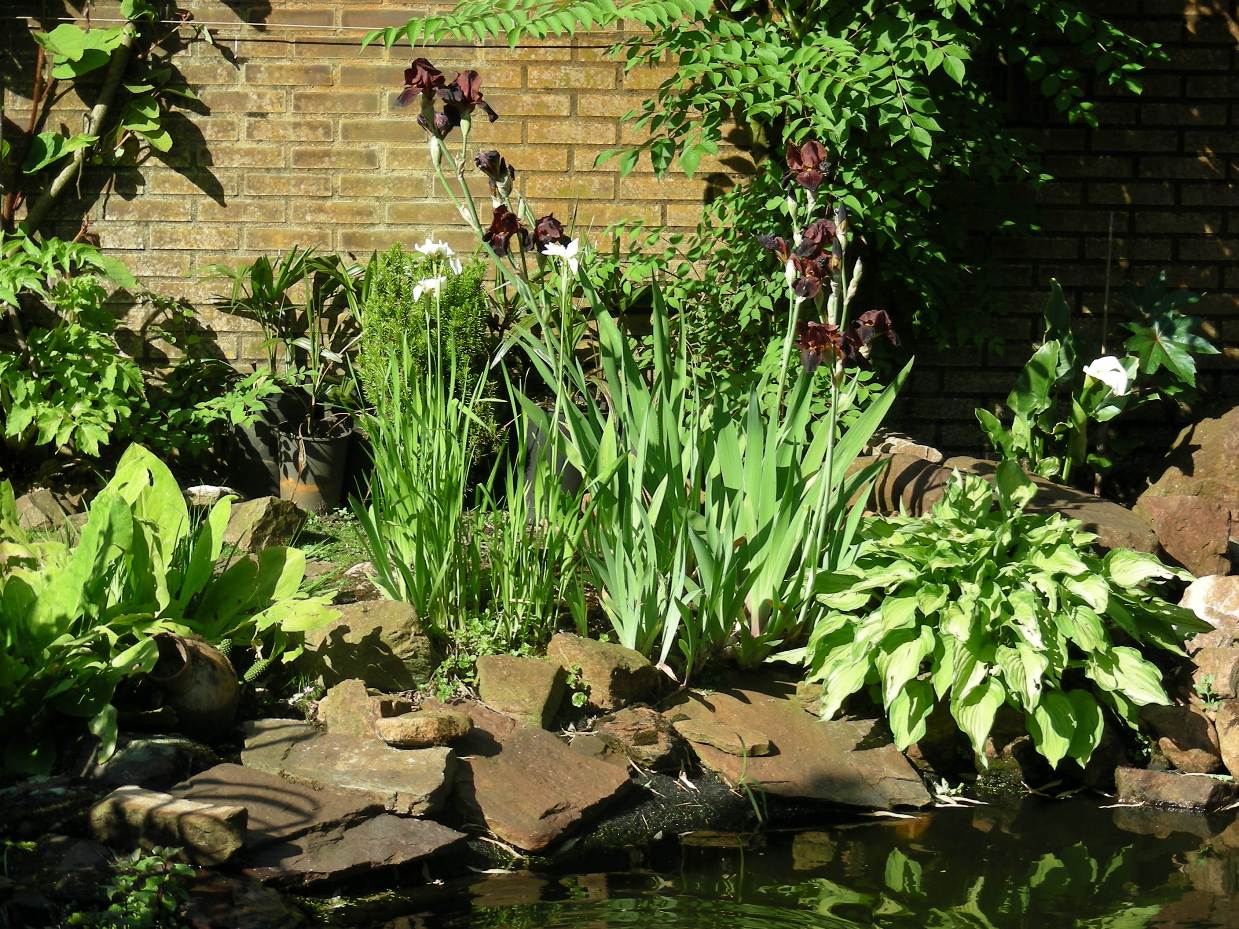 Rondom de vijver hebben we regelmatig gewisseld van planten. De planten (vooral bladplanten) zoals we die nu hebben staan al een aantal jaren en bevallen erg goed.