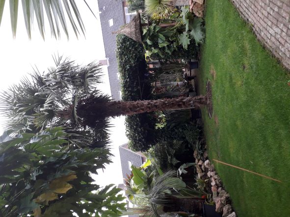 De Trachycarpus fortunei is een winterharde palmboom. De palm geeft een fantastische indruk met zijn ruige, vezelige bast en waaiervormige bladeren. De stam is in het algemeen wat dunner aan de onderkant en wat dikker aan de bovenkant. Trachycarpus fortunei zal ongeveer 10 - 12 meter hoog worden.