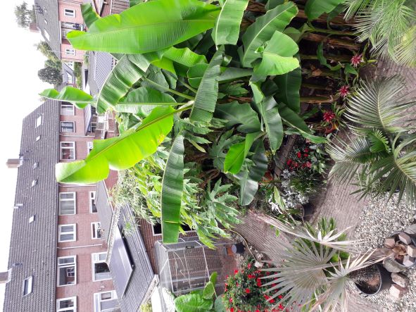 Wilt u direct het gevoel van de jungle in uw tuin hebben? Plant dan een musa basjoo. Deze winterharde banaan groeit snel en produceert enorme prei-achtige pseudo-stammen van ongeveer 2m lengte, met een kroon van zeer grote, exotische, leerachtige bladeren met een lengte van 2m en een breedte van 70cm. De vruchten zijn niet echt eetbaar en in ons klimaat kan de plant slechts met veel moeite tot bloei worden gebracht, omdat het daar 1 tot 2 jaar warmte voor nodig heeft. Maar het is een echte blikvanger! U kunt het zowel in de volle grond als in een grote pot planten