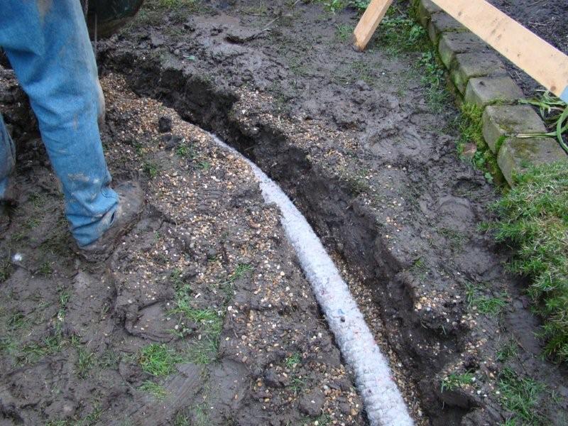 Het systeem werkt als volgt : buizen leggen ( inderdaad op fijne kiezeltjes) eventueel T stukken steken bij vertakkingen. Deze buizen lopen geleidelijk naar beneden ( is maar enkele cm. verschil ) .
