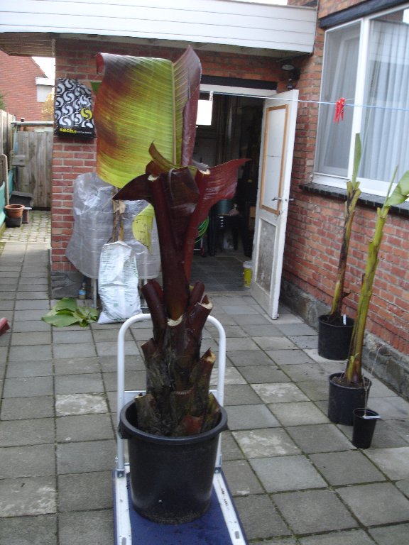 ben gisteren dan maar begonnen met de tuin leeg te maken,alle bladeren van de bananen afknippen,uit steken en oppotten en alles naar binnen in de garage