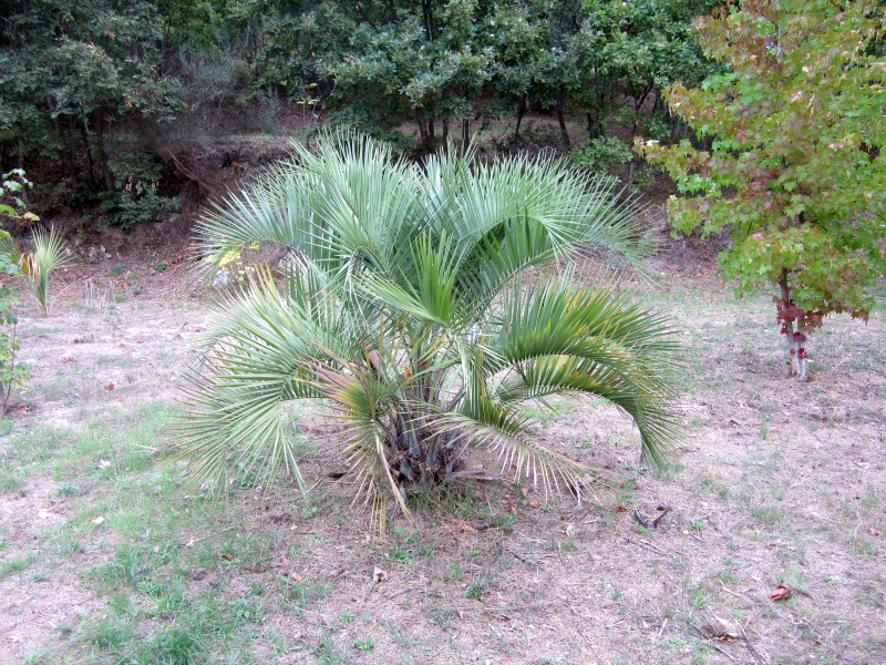 Deze palm geeft al jaren vruchten. De bessen smaken heerlijk en de zaden gooi ik overal neer. Vreemd genoeg heb ik nog nooit een kiemplantje ontdekt; daarom heb ik nog geen werk gemaakt van het zaaien van deze vruchten. Dit terwijl de Chamaerops humilis zich wel uitzaait en er zelfs een zaailing van Phoenix canariensis op ons terrein staat. (Geen idee waar die vandaan komt, onze eigen plant heeft nog niet de bloeibare leeftijd bereikt).