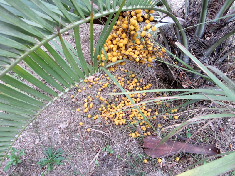 De Butia capitata die ik 11jr geleden als klein p9-plantje meenam uit NL geeft de laatste jaren vruchten in de herfst. Dit jaar is de oogst heel ruim. Zie foto's. De palm is nu circa 2m hoog en breed en begint zich nu bijna te strekken.