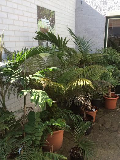 Alle tropische palmen + boomvarens staan met deze dagen nu in de schaduw om verbranding te voorkomen.