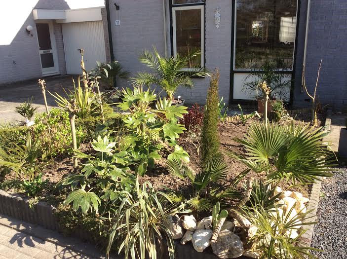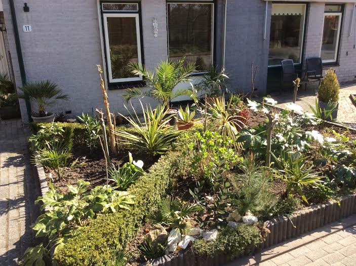 De voortuin moet dit jaar minder druk als vorig jaar, ik heb de tetrapanax verplaatst + de musa basjoo. De laatste heb ik bij de andere basjoo gezet om een grotere/vollere plant te krijgen. In de winter is dit ook een stuk makkelijker te beschermen. De tetrapanax staat nu in de achtertuin in de schaduw/half zon border met als onderbegroeiing varens, slaapkamergeluk met als buren de mooie bamboe Chimonobambusa tumidinoda. Ook de grote krenteboom is er uit dat betekent meer ruimte voor de bananen