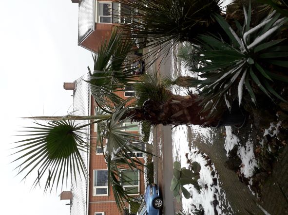 Ondanks de washingtonia ongeveer -7 a -8 graden vorst gehad heeft ziet hij er nog niet verloren uit