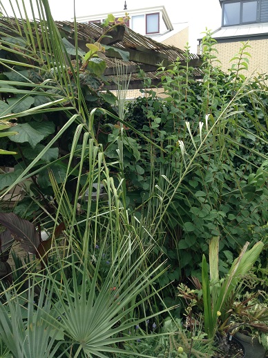De schuttingbekleding met bamboe is van 2010 en het bamboedakje op de pergola van deze zomer.