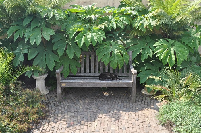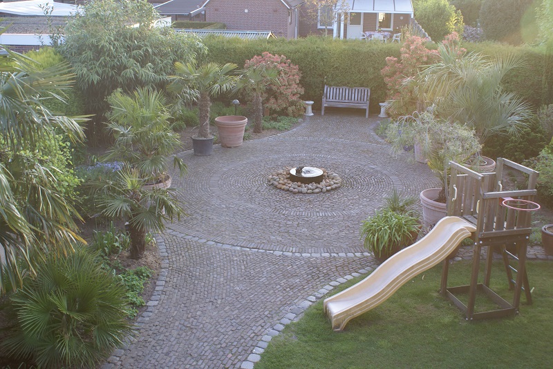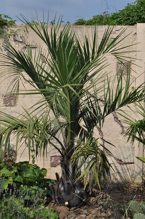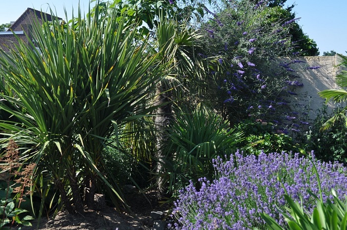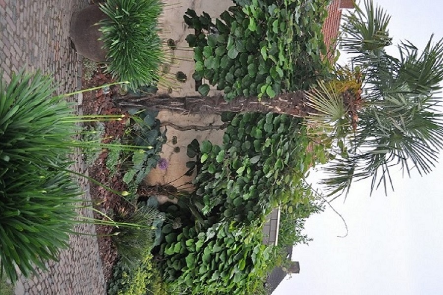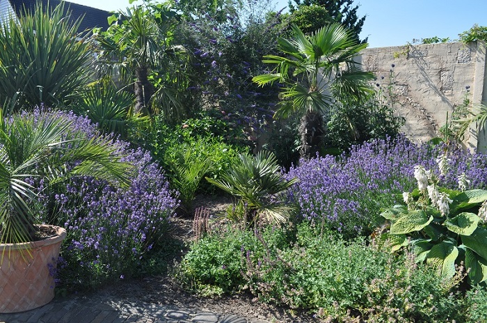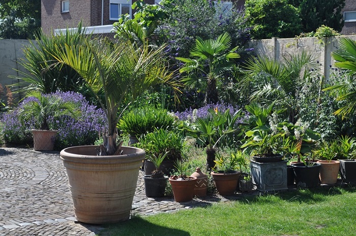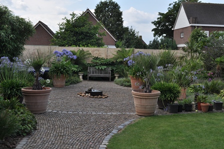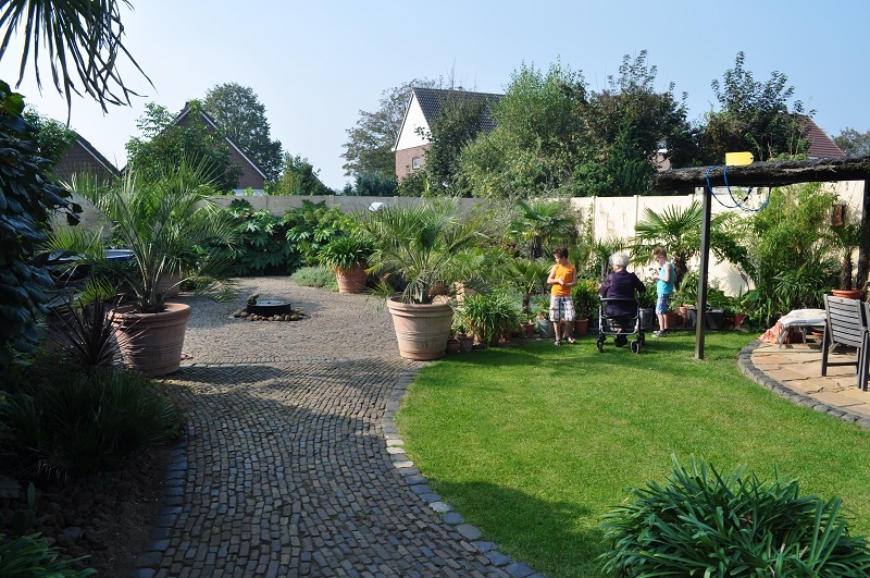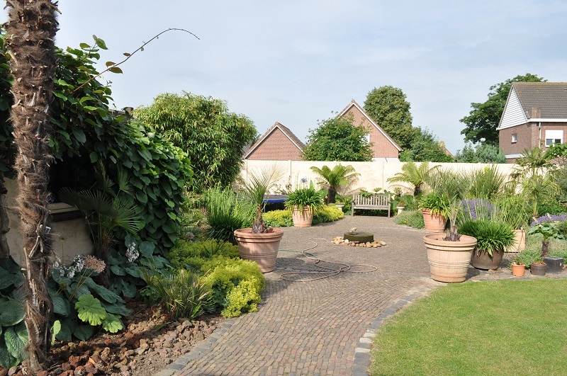 De buitenhaag bestond uit een 1,5 meter dikke haag coniferen. Deze heeft 5 jaar gelden plaats gemaakt voor betonnen platen. Deze zijn zodanig bewerkt dat het nu lijkt op een oude mediterriaanse muur. In die tijd had ik een trachycarpus in mijn tuin, gekregen met mijn verjaardag. Nu heeft hij een stam van 4 meter.Steeds meer trachy,s kwamer er bij. Inmidels staat er in de volle grond: trachy,s ,3 wagneranius, 2 grote dicksonia,s 2 cordyline en chaemerops butia en terapanax.