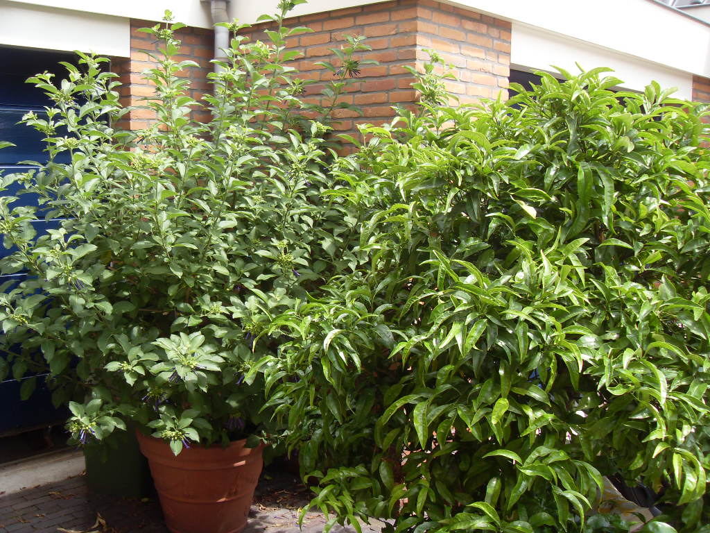 Iochroma naast citrus. De Iochroma staat vol met knoppen.