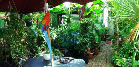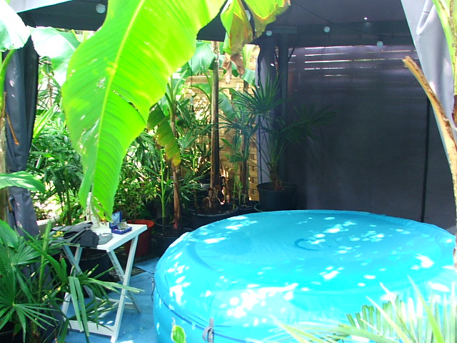 Waar de kas dus stond, staat nu het tentje, en toen het zwembad er stond, stonden de palmen en bananen daar decoratief rond omheen, wat imo wel het mooiste was, maar dit tentje en straks wellicht het gebouwtje, heeft een hoop voordelen, zoals meer warmte, privacy, geen lawaai vd pomp en het gebubbel als je er na een nachtje stappen er nog in wil, en vooral niet elk jaar een kas moeten opbouwen en afbreken.