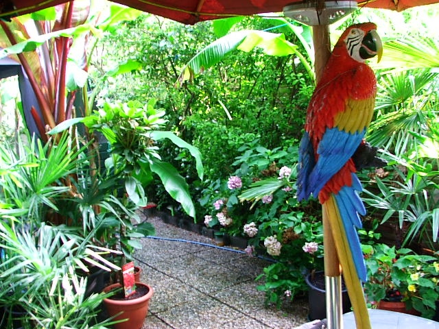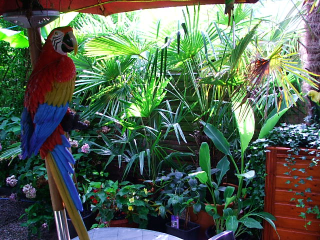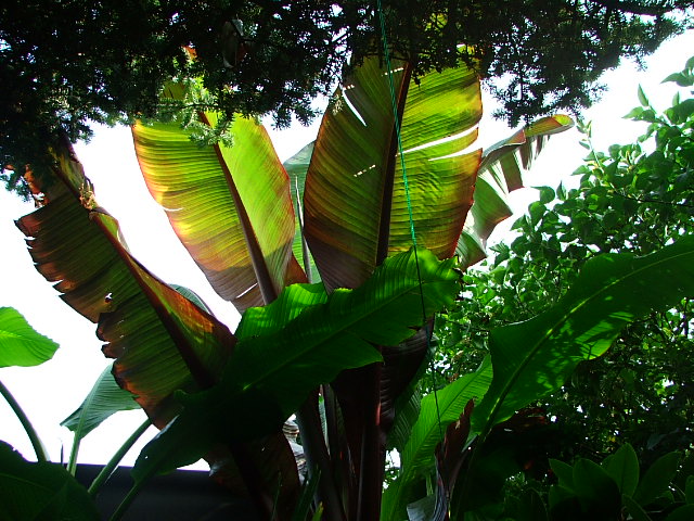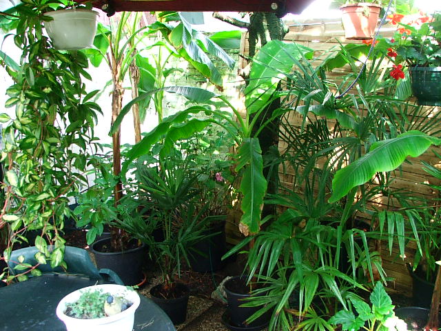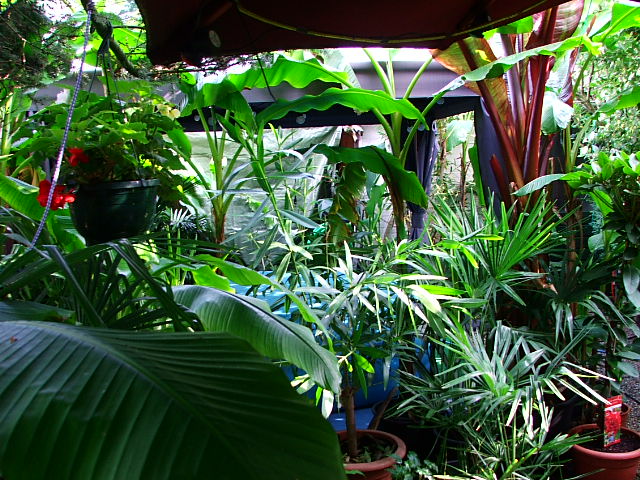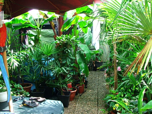 en ik van daaruit zo in de tuin kijk. links zie je nog net een ensete maurelli achter de paal staan wiens hoogste blad op 4 meter hoogte zit.