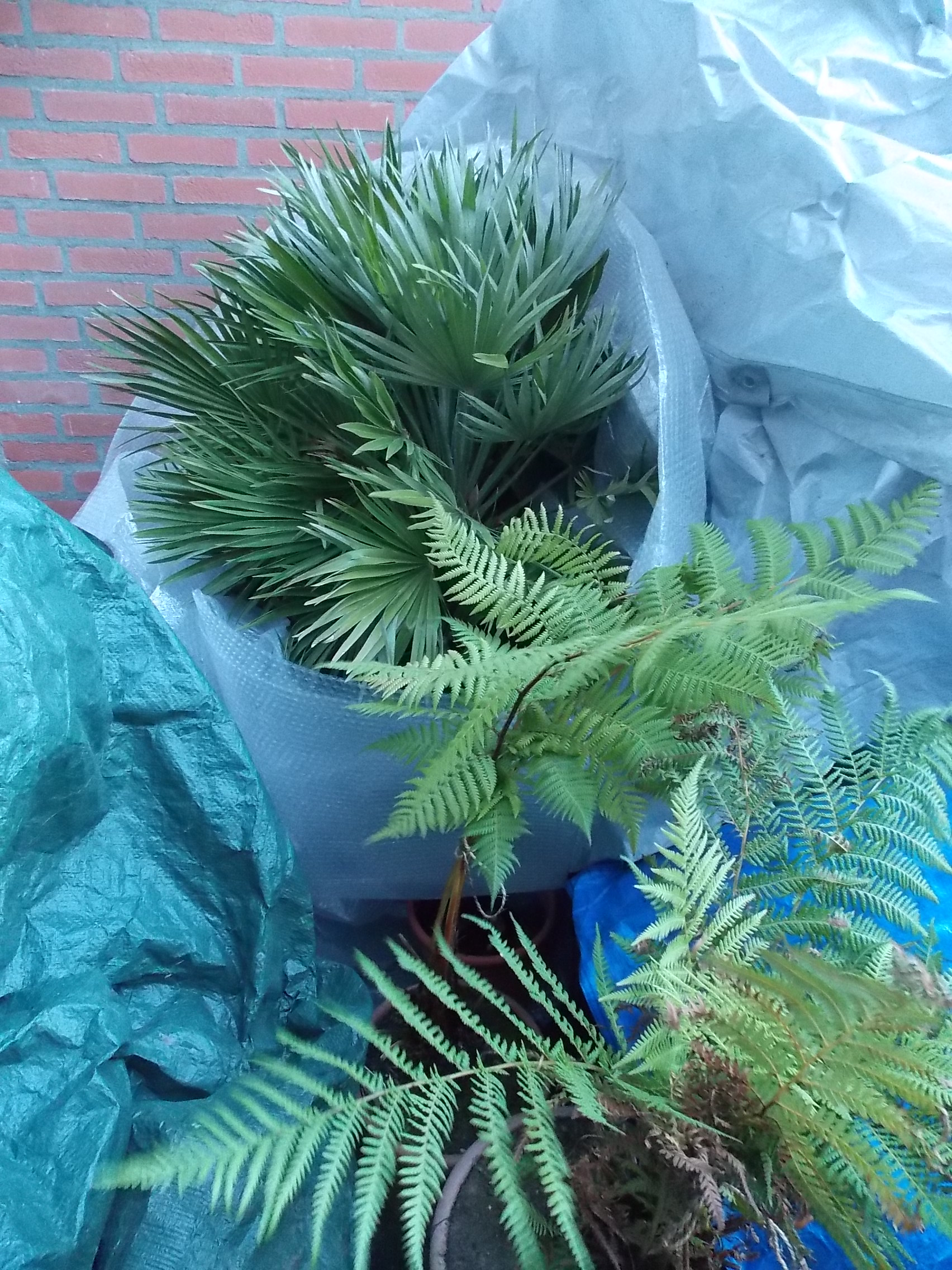 De chamaerops vulcano kan ook weer uitgepakt worden, heeft de eerste 'winterprik' goed overleeft buiten in pot.
