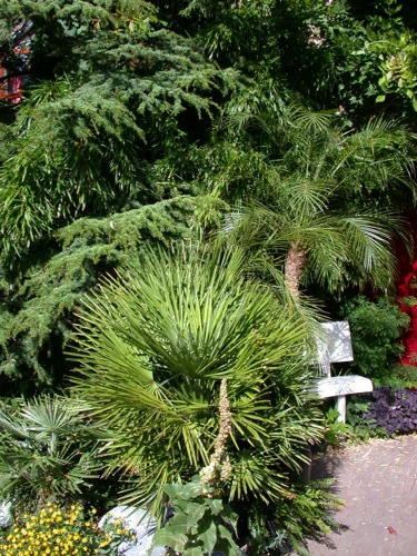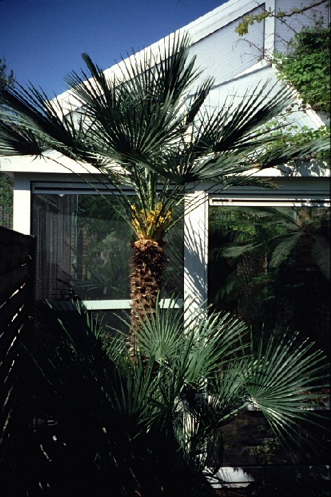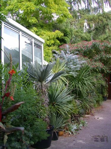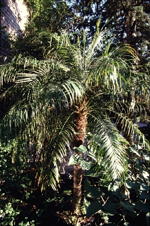 Deze Phoenix roebelenii in kuip heeft een van de recente winters in de nieuwe (vorstvrije) koude kas niet overleefd. In de voormalige gevelkas bleef het wintermin. beperkt tot 10 °C. De Livistona australis (20/21) is een van de weinige langjarige overlevenden.