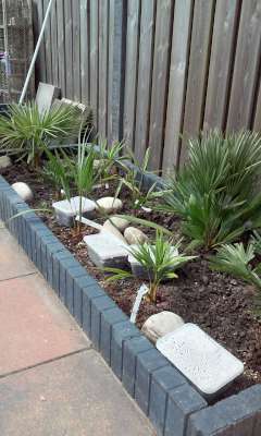 En dan kom je erachter dat je wat plantjes over hebt.... :? wat doe je dan...je verwijderd nog wat tegels vliegt naar de bouwmarkt voor een leuke border en plaatst die vervolgens. :D waarbij je er vervolgens achterkomt dat er veel klei in de grond zit op die plek.. :cry: maar eind goed al goed.. :thumb_up: